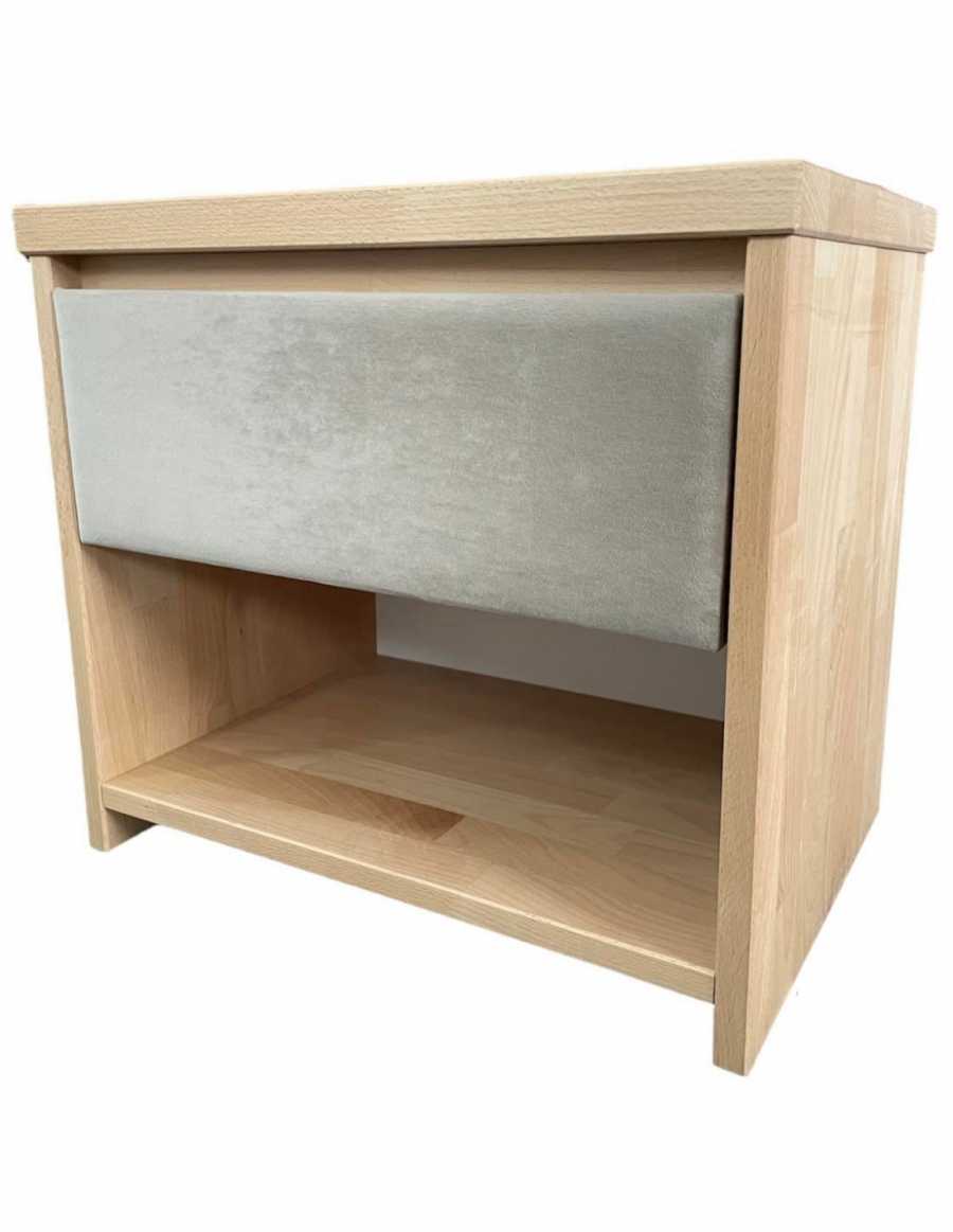 Nočný stolík TNS 2 z masívneho bukového dreva v jednoduchom, ale praktickom prevedení so zásuvkou s guľôčkovým výsuvom v hornej časti a policou v spodnej časti.