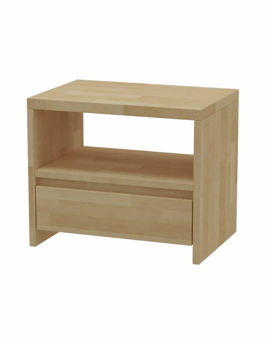 Nočný stolík TNS 3 z masívneho dreva v originálnom praktickom dizajne. Jednoduchý nočný stolík s policou v hornej časti a zásuvkou s guľôčkovým výsuvom v spodnej časti.