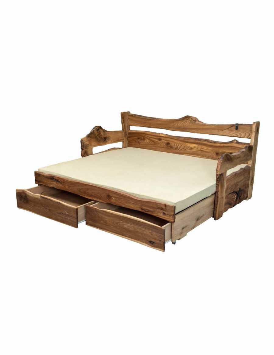 Drevená posteľ je vyrobená z masívu o hrúbke 40 mm. Brestová rozkladacia posteľ s úložným priestorom ponúka 3 varianty využitia - sedačka, jednolôžko, dvojlôžko. Masívna posteľ je vhodná do dizajnových interiérov, vyniká atypickým spracovaním, v interiéroch pôsobí ako dominujúci centrálny prvok, preto je vhodná do väčších vnútorných priestorov.