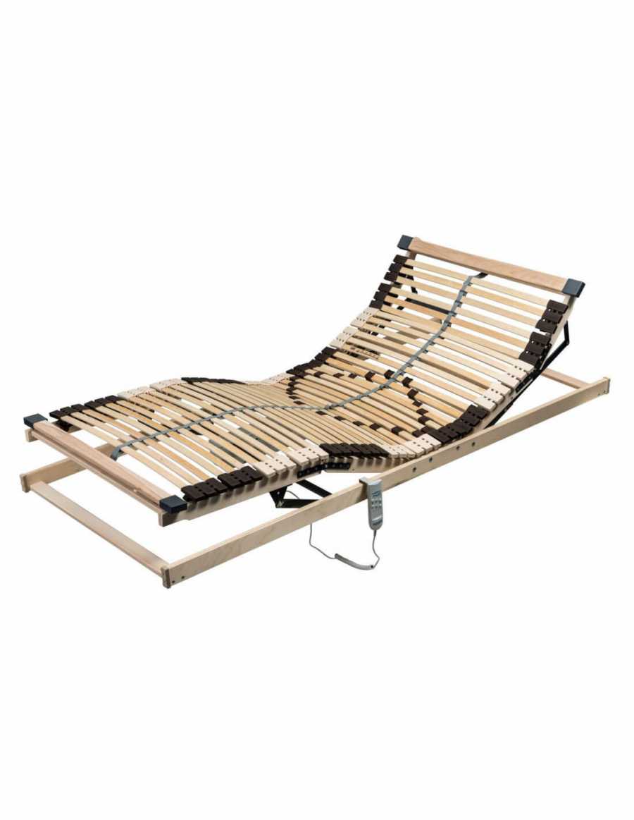 Vysoko kvalitný elektrický lamelový rošt do postele TRIPLE NATUR MOBIL T12 s motorovým polohovaním časti pod hlavou a časti pod nohami je tvorený 42 lamelami, ktoré zaisťujú dobrú vetrateľnosť, odvod vlhkosti a rovnomerné rozloženie váhy. 12 zdvojených lamiel s posuvnými opaskami umožňuje regulovať tuhosť a tým aj tlak vytváraný na matrac v bedrovej oblasti. Posúvaním opaskov je možné tvrdosť matraca buď zvýšiť alebo znížiť. Pružné lamely uložené v trojiciach v kaučukových púzdrach sú rozložené do 7 anatomických zón. Stredový spevňujúci textilný popruh zaisťuje pevnosť roštu a bráni prelomeniu lamely pri extrémnom bodovom zaťažení. Prídavná lišta na okrajoch roštu rovnomerne podopiera matrac aj na okrajoch pri nohách a v hornej časti matraca. Zamedzuje deformácii okrajov matraca a predlžuje jeho životnosť. Polohovateľný posteľný rošt ponúka nosnosť až 130 kg.